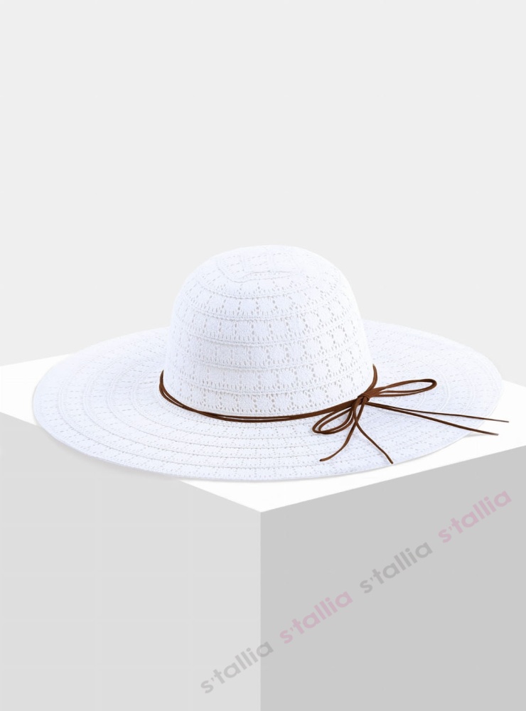 Пляжные аксессуары от европейского производителя Feba. Стильная плетённая шляпа с широкими полями в белом цвете. Дополнена коричневым ремешком. Отлично пропускает воздух и защищает от ультрафиолета. Прекрасно дополнит купальники и пляжную одежду. Состав:100% пресс-папье