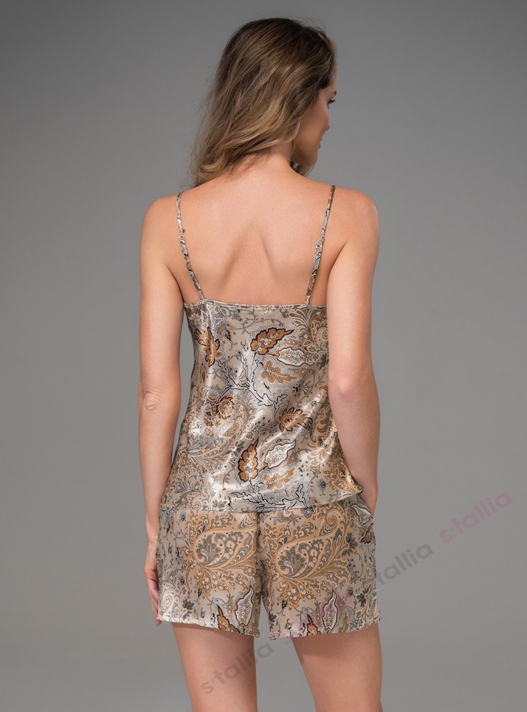 Итальянская домашняя одежда. Комплект из натурального принтованного шелка. Состоит из топа на тонких регулируемых бретелях и коротких шортиков. Декорирован вставками из контрастных кантов. Может быть дополнен кимоно из этой же коллекции. Коллекция "Ливия". Состав: 70% натуральный шелк, 25% полиэстер, 5% эластан.