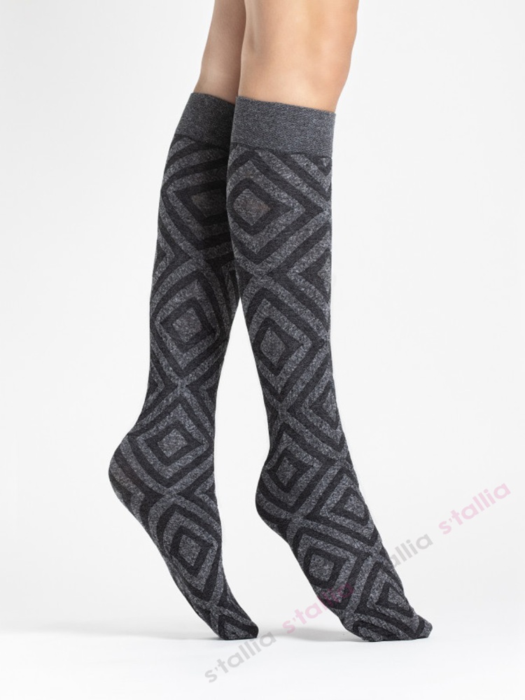 Гольфы от европейского производителя Fiore. Стильные гольфы из микрофибры плотностью 60 den с вывязанным меланжевым геометрическим рисунком. Состав: 58% полиамид 30% полиэстер 12% спандекс