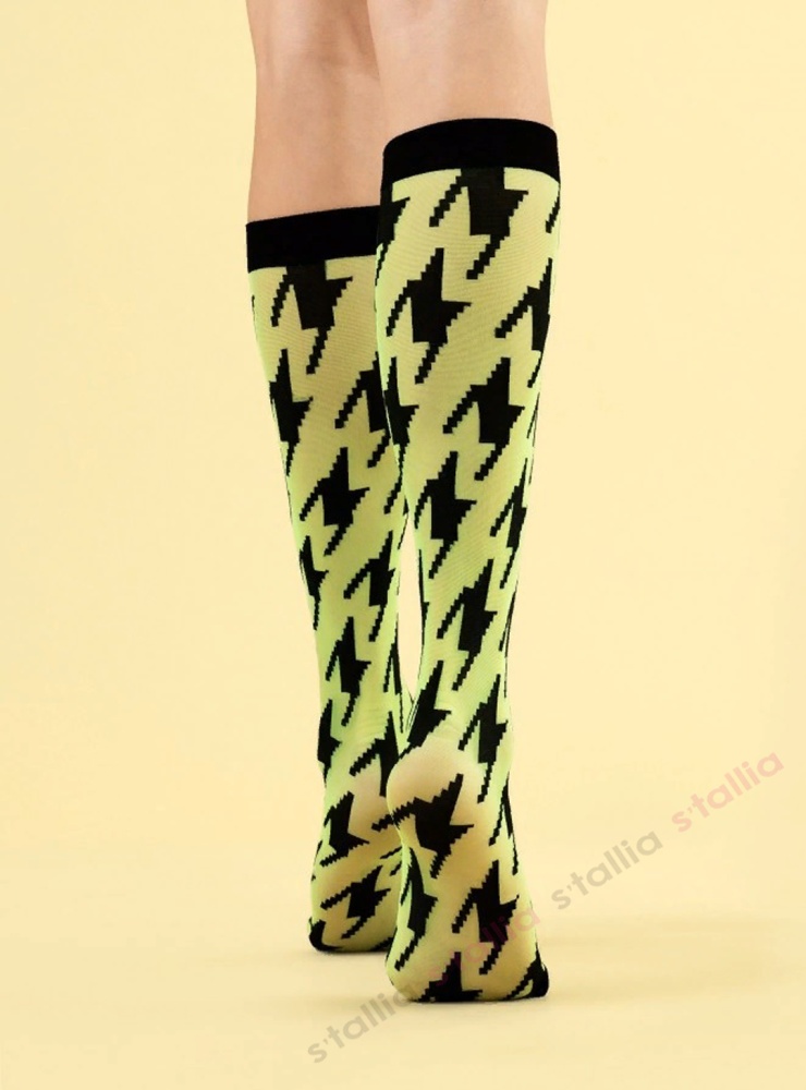 Гольфы от европейского производителя Fiore. Стильные гольфы плотностью 8den с вывязанным контрастным геометрическим рисунком. Состав: 95% полиамид, 5% эластан