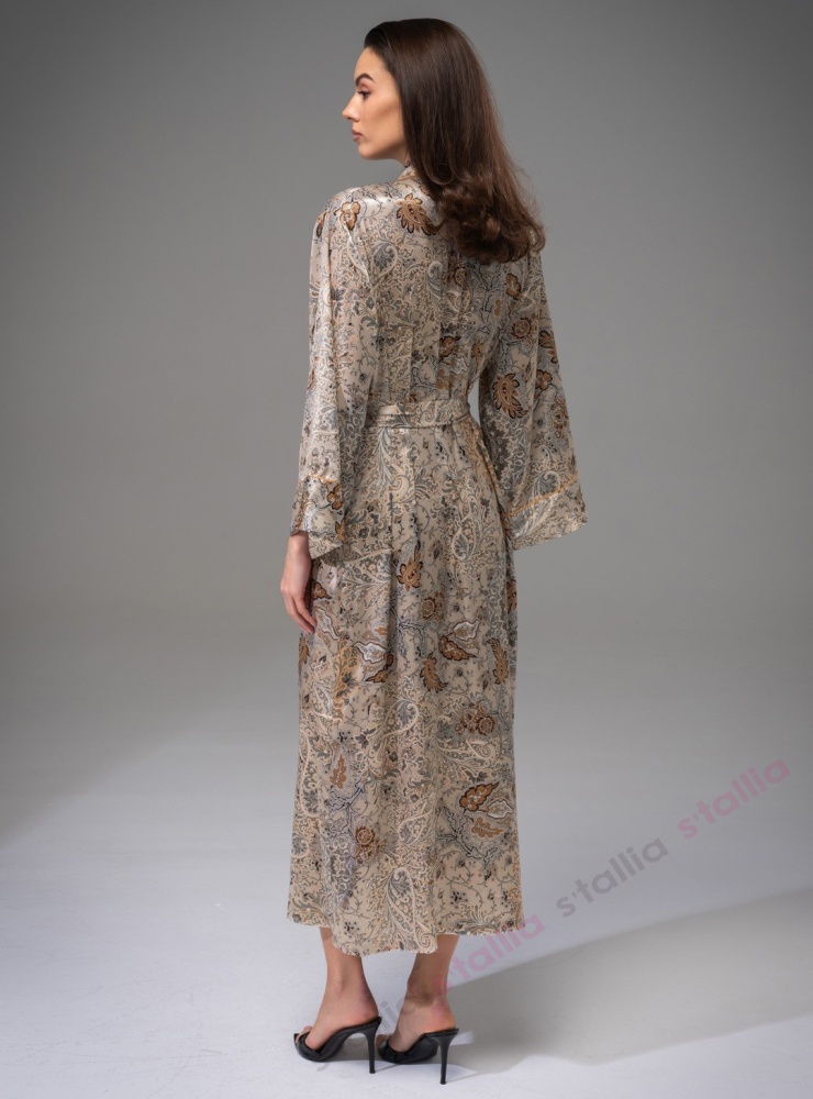 Итальянская домашняя одежда. Длинное кимоно из натурального принтованного шелка с боковыми втачными карманами. Завязывается на пояс. Прекрасно дополнит сорочку и комплект из этой же коллекции. Коллекция "Ливия". Состав: 70% натуральный шелк, 25% полиэстер, 5% эластан.