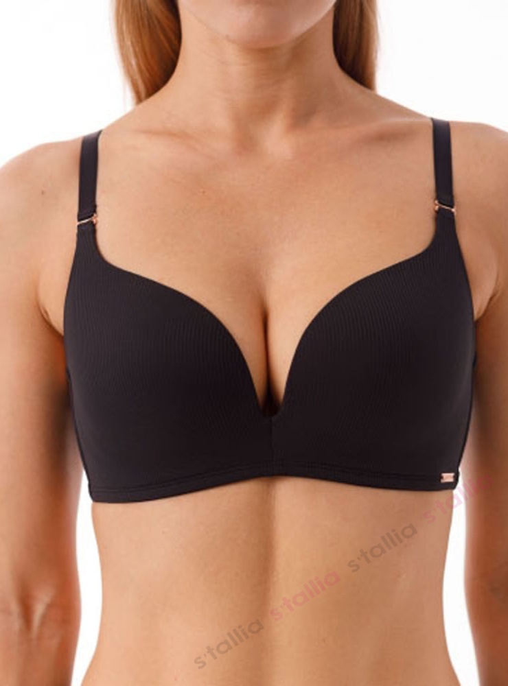 Бюстгальтер «пуш-ап» на поролоне бескостный, выполнен из шелковистой микрофибры в рубчик. Чашка планж, декольтированная. Бретели съемные с регулировкой. Украшение: медальон COQUETTE REVUE. Коллекция "Lucky