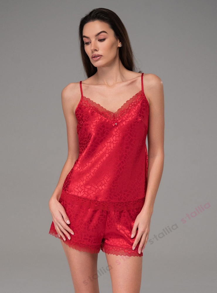 Итальянская домашняя одежда. Комплект из искусственного шелка с жаккардовым рисунком. Состоит из топа и коротких шортиков. Вырез декорирован ажурным кружевом с кокетливым бантиком и подвеской. Бретели регулируются. Коллекция "Джоанна". Состав: 100% полиэстер.