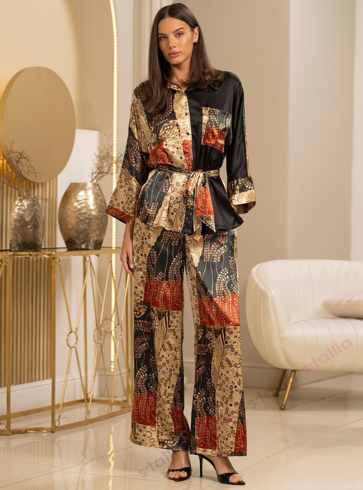 Итальянская домашняя одежда. Комплект с брюками из натурального принтованного шелка в стиле Ар-Нуво. Состоит из рубашки с широкими рукавами 3/4 и брюк с втачными карманами. Завязывается на поясок. Коллекция "Климт". Состав: 70% натуральный шёлк, 25% полиэстер, 5% эластан