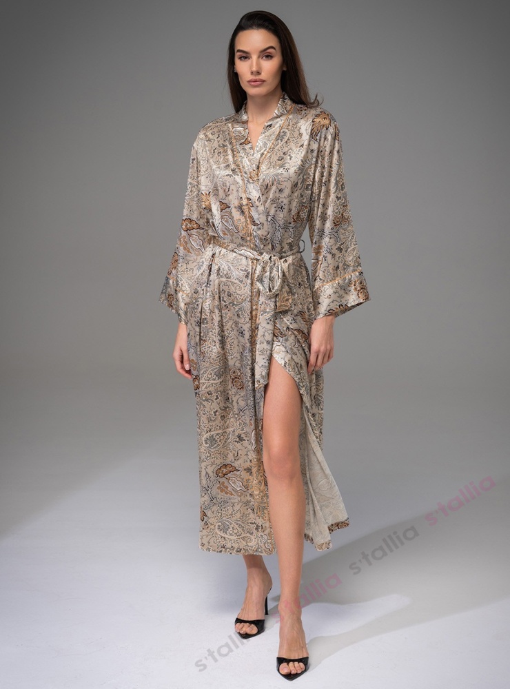 Итальянская домашняя одежда. Длинное кимоно из натурального принтованного шелка с боковыми втачными карманами. Завязывается на пояс. Прекрасно дополнит сорочку и комплект из этой же коллекции. Коллекция "Ливия". Состав: 70% натуральный шелк, 25% полиэстер, 5% эластан.