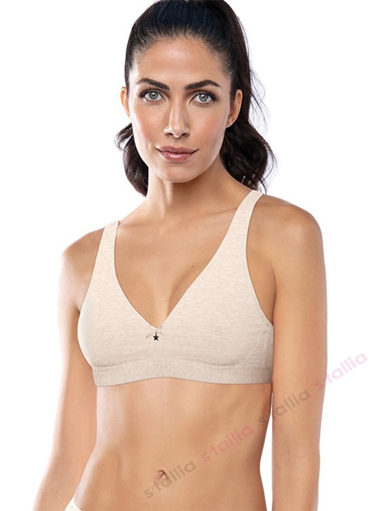 Итальянское нижнее белье. Бюстгальтер бралетт без каркасов. Выполнен из мягкого, двухслойного и гипоаллергенного хлопка. Боковые детали усилены упругими вертикальными пластинами. Под грудью широкая плоская резинка, покрытая хлопковым трикотажем которая обеспечивает комфортную посадку. Бретели регулируются. В комплекте дополнительный крючок для трансформации бретелей. Бюстгальтер декорирован подвеской в виде маленькой сверкающей звездочки. Может быть дополнен плавочками слип или миди из этой же коллекции. Коллекция "Cottone biologico". Состав:хлопок 95% эластан 5%