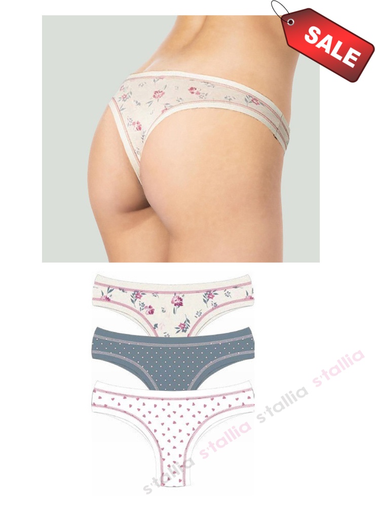 Женское белье от итальянского бренда Cotonella. Женские трусики-бразилиана из мягкого, эластичного хлопка с принтами-"цветочки","горошки","сердечки". Модель с удобной и комфортной посадкой. Трусики не передавливают и не стесняют движения. 3 штуки в упаковке. Состав: 95 % хлопок 5% эластан.