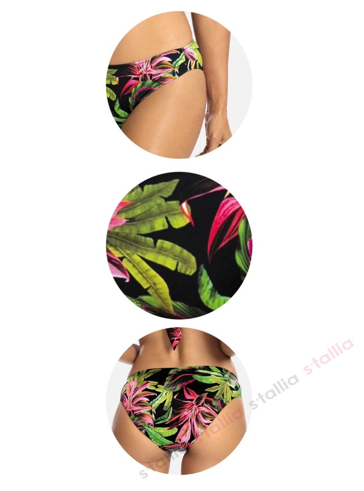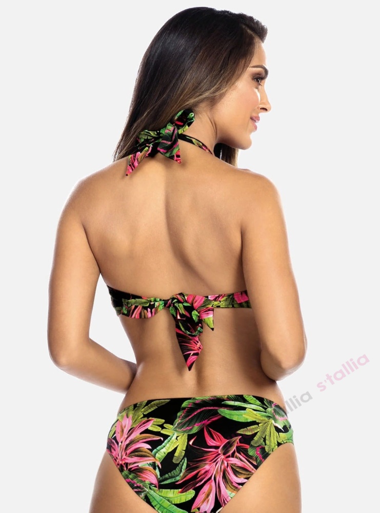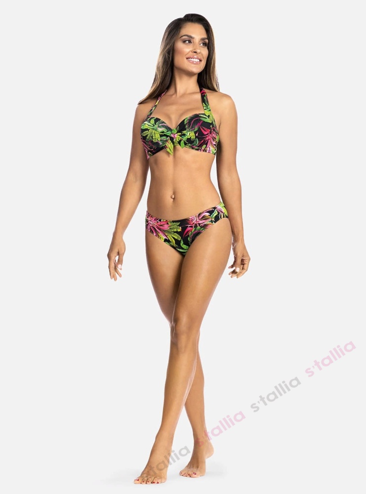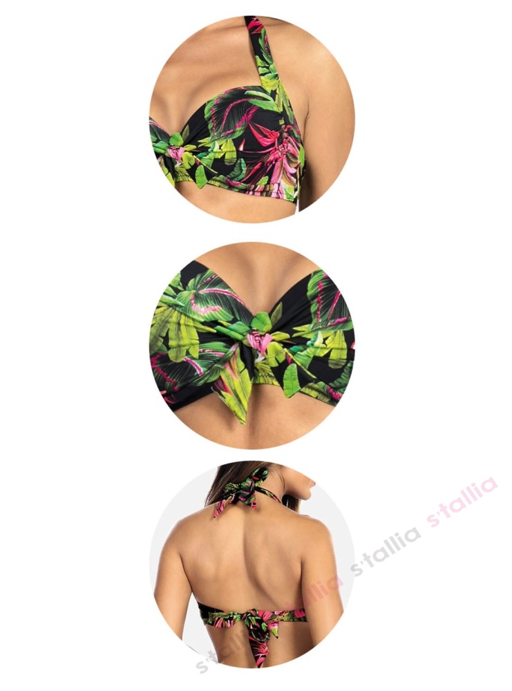 Купальники европейского производства. Яркий раздельный купальник. Бюстгальтер с формованными чашечками без косточек и дополнительными вынимающимися вкладышами "пуш-ап". Завязывается на шее и спине, что позволяет регулировать высоту груди и обьем. Широкая боковая бретель центрует грудь, придает красивую форму декольте и прекрасно скрывает недостатки в области подмышек. Модель бюстгальтера прекрасно подойдет на чашки B и C. Боковые детали укреплены упругими вертикальными пластинами. Плавочки классические. Купальник может быть дополнен халатом, парео и блузой из этой же коллекции. Коллекция "Jungle".