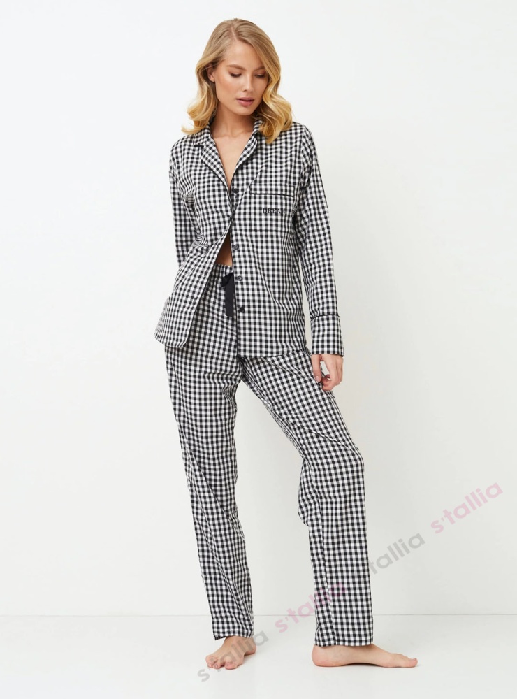 Уютная женская пижама от европейского производителя Aruelle выполнена из хлопка с принтом клетка. Рубашка прямого силуэта застегивается на пуговицы. Дополнена накладным карманом на груди с вышивкой Брюки свободного кроя с мягкой резинкой в поясе дополнены декоративным бантом. В боковых швах удобные втачные карманы. Состав: 100% хлопок.