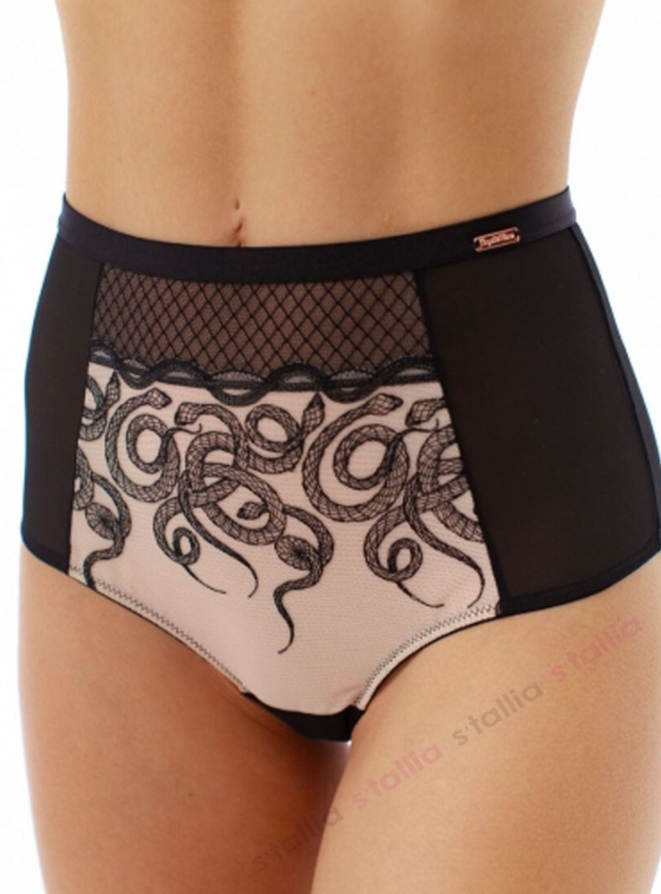 Женское белье от европейского производителя Coquette Revue. Роскошные высокие плавочки в черно-бежевом цвете. Выполнены из тюлевой сеточки с рисунокм змеи. Хлопковая ластовица для дополнительного комфорта. Прекрасно дополнят бюстгальтеры из этой же коллекции. Коллекция "Snake". Состав: Полиамид 85%, Эластан 10%, Хлопок 5%